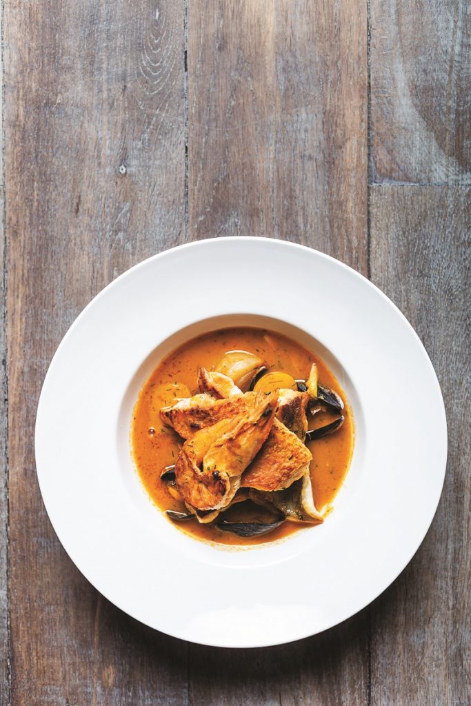 Σάλτσα rouille: Βράζουμε την πατάτα σε νερό και την καθαρίζουμε ενώ είναι ζεστή. Τη λιώνουμε με πιρούνι σε ένα βαρύ, βαθύ σκεύος προσθέτοντας το σκόρδο, αλάτι και πιπέρι. Προσθέτουμε τους κρόκους και δουλεύουμε το μείγμα να γίνει λείο. Αρχίζουμε τότε να ρίχνουμε σιγά-σιγά το ελαιόλαδο ανακατεύοντας συνέχεια με τον αυγοδάρτη, όπως κάνουμε για τη μαγιονέζα, μέχρι να ενσωματωθεί και να αποκτήσει την υφή της μαγιονέζας. Λαδώνουμε ελαφρά τις φέτες του ψωμιού -που έχουμε τρίψει με σκόρδο- και τις φρυγανίζουμε στο γκριλ. Αφαιρούμε τα ψάρια από τον ζωμό και τα μεταφέρουμε σε πιατέλα. Σερβίρουμε σε πιάτα συνοδεύοντας με τη σάλτσα και με το φρυγανισμένο ψωμί και το τυρί χωριστά.