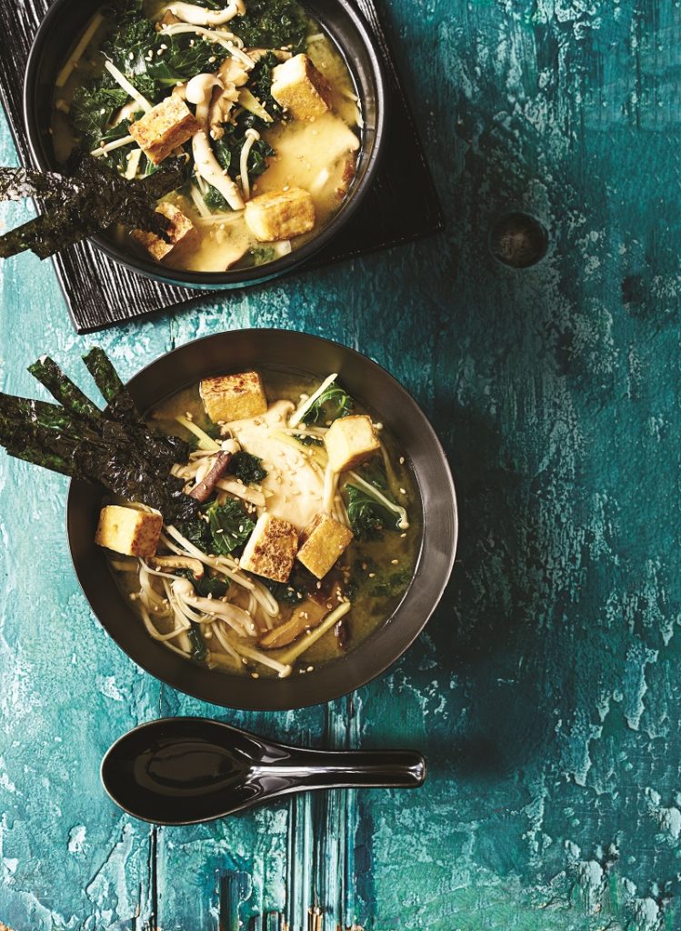 Σερβίρισμα: Βράζουμε τα αυγά σε ένα κατσαρολάκι, αναλόγως του πόσο σφιχτά τα θέλουμε. Ιδανικά, για μελάτο κρόκο, τα αφήνουμε για 4΄. Ρίχνουμε μπόλικο κρύο νερό για να σταματήσουμε τον βρασμό. Αφήνουμε στην άκρη. Ετοιμάζουμε παράλληλα το τόφου. Ζεσταίνουμε 1-2 κ.σ. σησαμέλαιο σε τηγάνι και σοτάρουμε τα κυβάκια τόφου για 2΄-3΄ μέχρι να πάρουν χρώμα από όλες τις πλευρές. Αφήνουμε στην άκρη μέχρι το σερβίρισμα. Προσθέτουμε στη σούπα τα νουντλς, ανακατεύουμε και τα αφήνουμε να βράσουν για 3΄. Προσθέτουμε το ξίδι ρυζιού και φρεσκοτριμμένο πιπέρι, ανακατεύουμε και αποσύρουμε από τη φωτιά. Σερβίρουμε τη σούπα καυτή με κυβάκια τόφου και αποξηραμένα φύκια (φύλλα), σε λωρίδες.