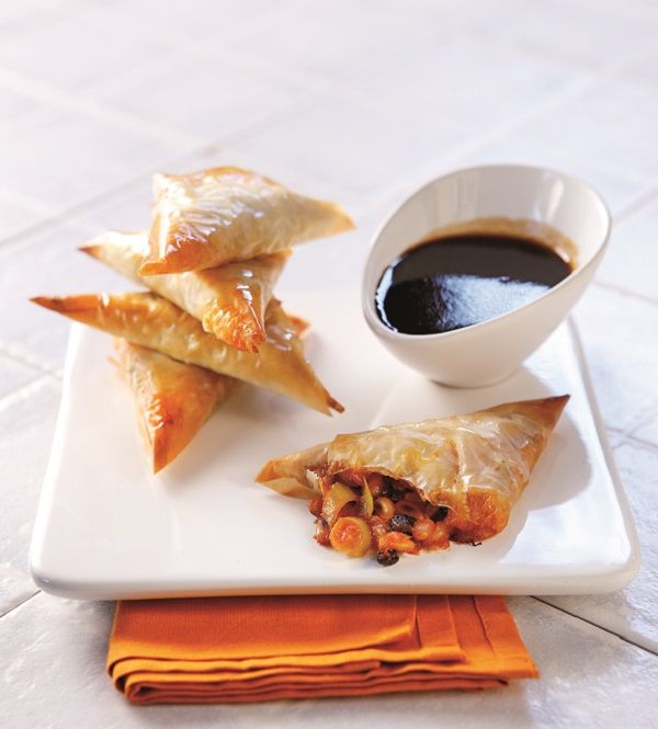 Τρίγωνα πιτάκια από τραγανό φύλλο κρούστας με γέμιση που συνδυάζει στεριά και θάλασσα μαζί: γαρίδα, πράσο, κουκουνάρι και σταφίδες. Ένα εξαιρετικό μεζεδάκι που θα σερβίρετε σαν ορεκτικό μαζί με μια πράσινη σαλάτα.