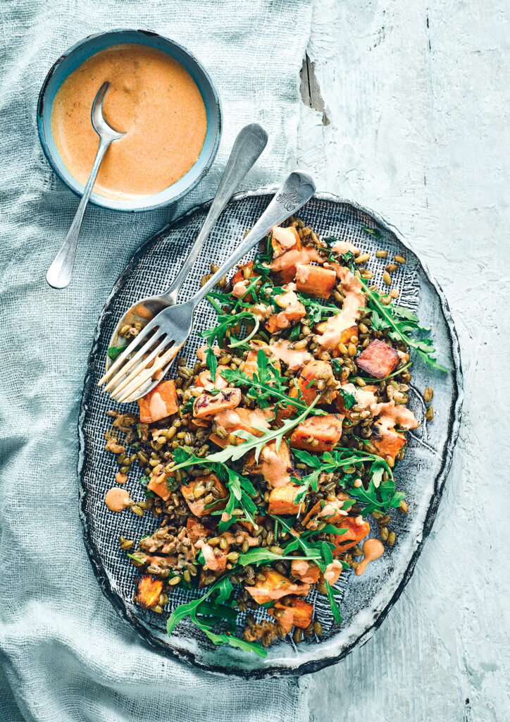 Σαλάτα με γλυκοπατάτες, freekeh και γιαούρτι–harissa: Η ισορροπία ανάμεσα σε γλυκό, καυτερό και δροσερό