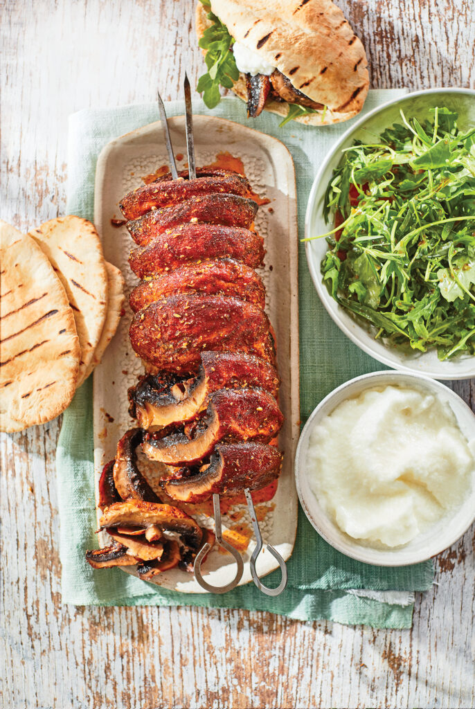 Το σουβλάκι μανιταριών shawarma με σκορδάτη σάλτσα δείχνει πώς οι παραδοσιακές τεχνικές προσαρμόζονται σε πιο σύγχρονες, plant-based εκδοχές. Τα μανιτάρια απορροφούν τα μπαχαρικά και δίνουν την ίδια σχεδόν αίσθηση με το κρέας. Δείτε την πλήρη εκτέλεση της συνταγής εδώ.
