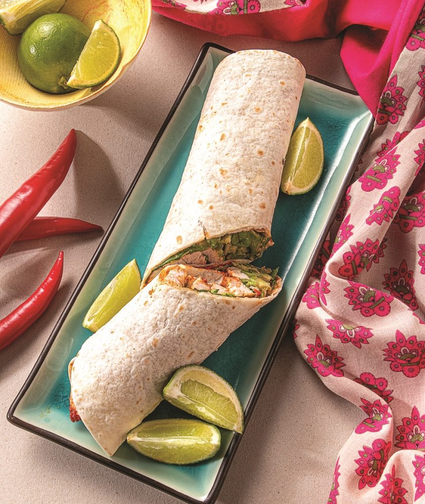 Τορτίγιες: Ανοίγουμε τις πίτες στον πάγκο εργασίας, απλώνουμε το αβοκάντο λιωμένο, τη σάλτσα πικάντικης ντομάτας, μαρούλι, το κοτόπουλο κομμένο σε φέτες πάχους 1 εκ. και το τριμμένο τσένταρ. Στύβουμε λίγο λάιμ, διπλώνουμε σφιχτά την κάθε πίτα, την κόβουμε στη μέση και σερβίρουμε.