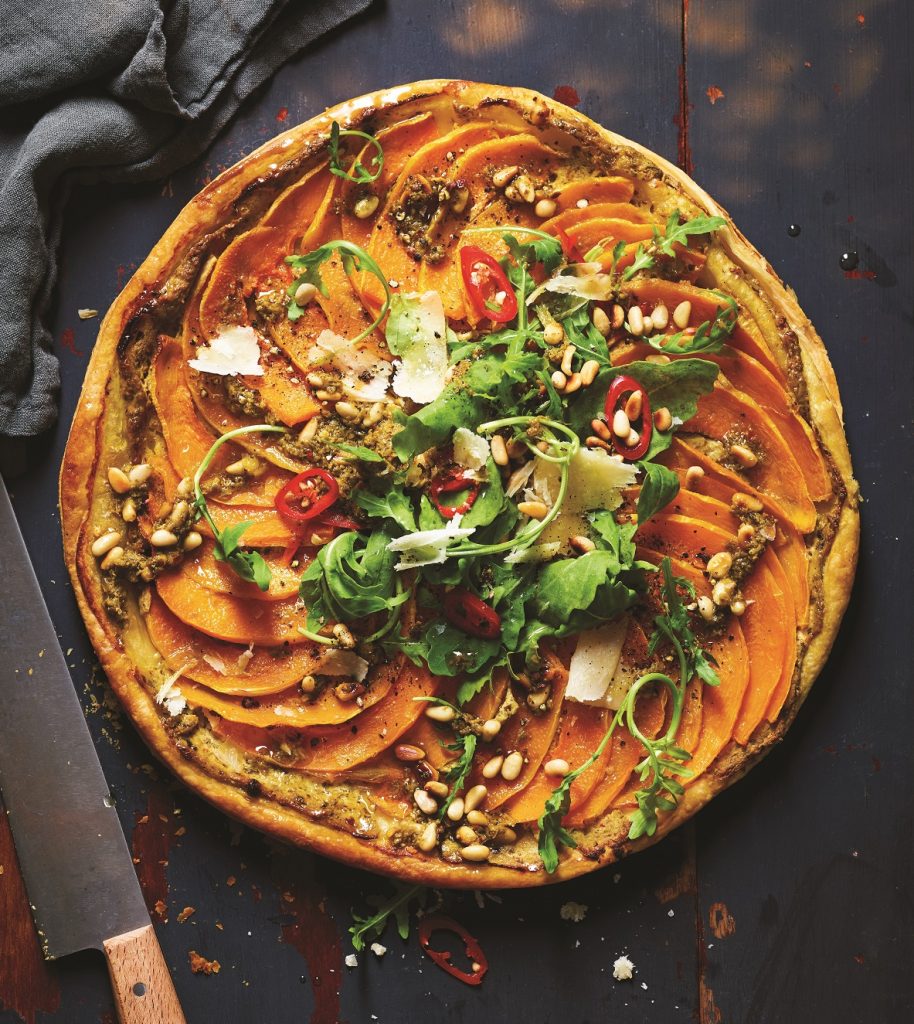 Μια αλμυρή τάρτα που ξεφεύγει από τα συνηθισμένα και γεμίζει με κολοκύθα, τυρί ρικότα και αρωματικό πέστο. Υπέροχο πρώτο πιάτο για ένα φιλικό τραπέζι, αλλά και σαν καθημερινό σνακ για όλη την οικογένεια, αφού με το έτοιμο φύλλο σφολιάτας χρειάζεστε μόνο 40 λεπτά για να την ετοιμάσετε.