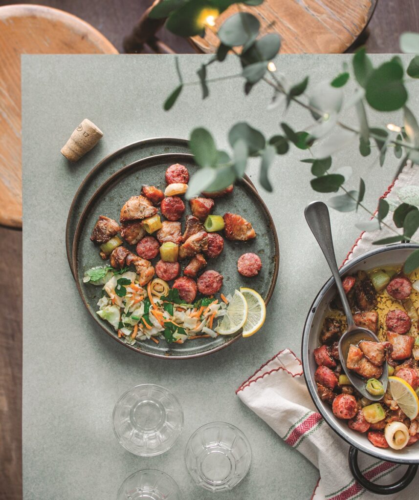Πρασοτηγανιά με χοιρινό και λουκάνικο