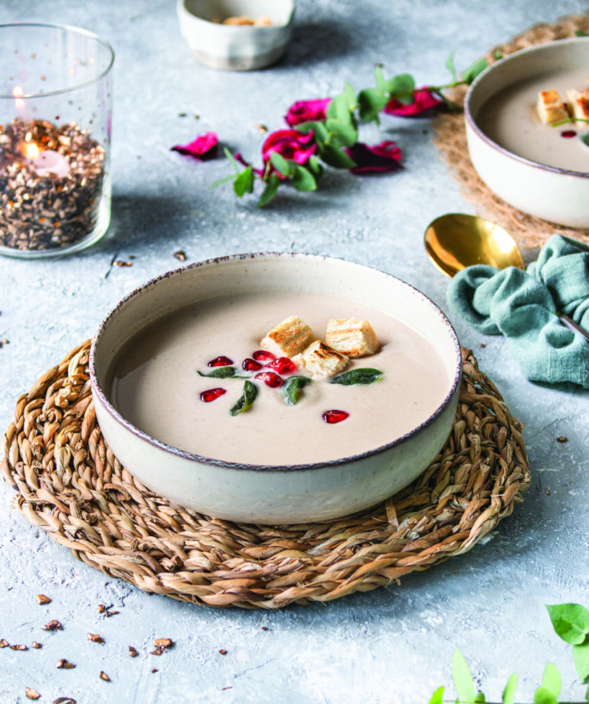 Η ευγενική γεύση της σελινόριζας συνδυάζεται µε τα ζωηρά µήλα και τα γλυκά κάστανα δηµιουργώντας µια εξαίσια και ισορροπηµένη βελούδινη σούπα. Δεν παραλείπουµε τα τραγανά φύλλα φασκόµηλου!