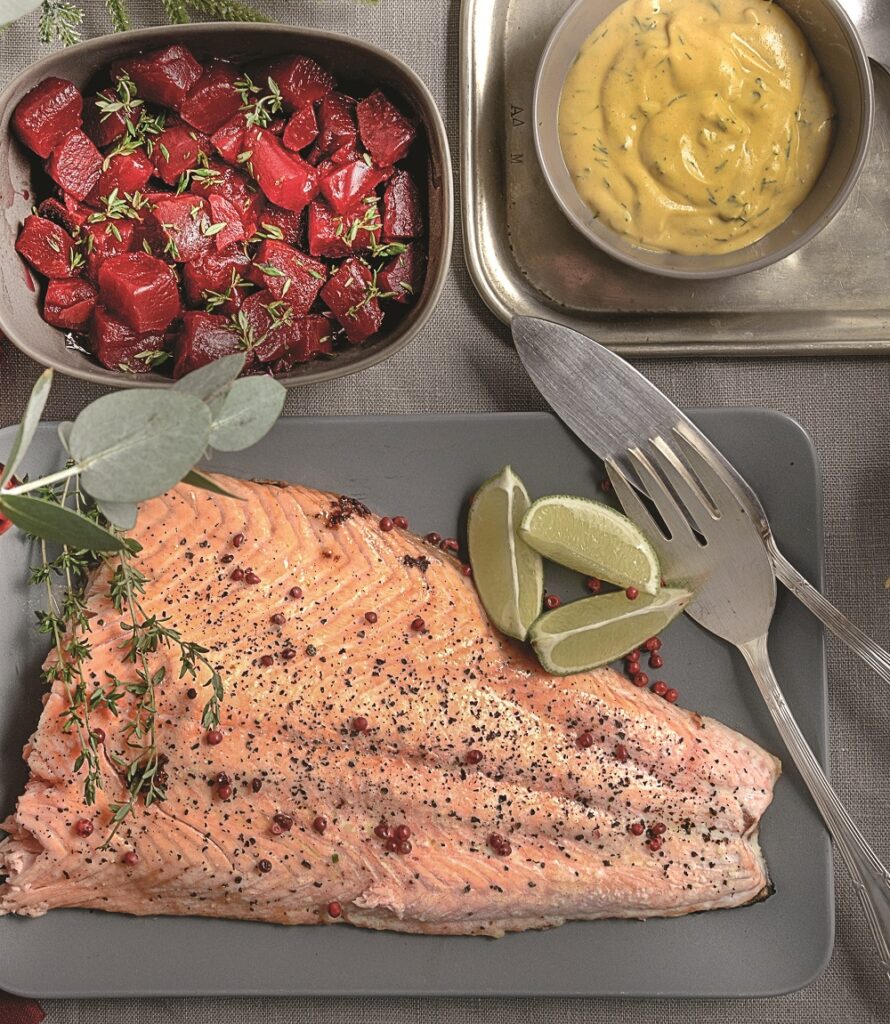 Αυτή η συνταγή για ψητό σολομό είναι εμπνευσμένη από τη Σκανδιναβία, όπου λόγω του κρύου αγαπούν τις πληθωρικές γεύσεις. Ταιριάζει άνετα με το γιορτινό κλίμα των ημερών, ενώ μπορείτε να τη συνοδεύσετε με μια απλή σαλάτα, χωρίς να χρειαστεί να φτιάξετε κάτι ακόμη.