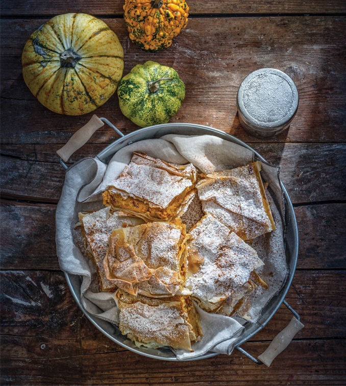 Αν η γιαγιά μου ήταν πίτα θα ήταν γλυκιά κολοκυθόπιτα κι αν οι χειμωνιάτικες Κυριακές μου στο σπίτι είχαν άρωμα θα ήταν αυτό του κανελογαρίφαλου και της καραμελωμένης ζάχαρης. Πληθωρική μέσα στην απλότητά της, μια παραδοσιακή συνταγή που κάνει το τέλειο επιδόρπιο. Η συγκεκριμένη νηστίσιμη πίτα είναι απόλυτα συνδεδεμένη στο μυαλό μου με την κολοκύθα. Θυμάμαι κόβαμε την κολοκύθα στη μέση, βγάζαμε τα σπόρια και ύστερα με ένα μεγάλο κουτάλι ξύναμε το εσωτερικό από όπου έβγαινε η ψίχα σε πολύ λεπτές λωρίδες. Όσο για τα υπόλοιπα υλικά: μαύρες και ξανθές στάφιδες, αμύγδαλα, ζάχαρη, κανέλα, γαρίφαλο, ένα σφηνάκι κονιάκ και ελάχιστο ρύζι για να ρουφίξει τα υγρά. Η γιαγιά την έφτιαχνε με ελαιόλαδο (εννοείται!) ωστόσο εγώ περνώντας τα χρόνια έχω πειραματιστεί λιγάκι και έχω διαπιστώσει ότι της πάει τρελά το σησαμέλαιο. Οπότε γενικά τη φτιάχνω με σησαμέλαιο που δίνει απίστευτο άρωμα και γεύση ενώ ρίχνω στη γέμιση και μισή χούφτα σουσάμι που γενικά μου αρέσει. Ένα άλλο “twist” που κάνω είναι να βάζω μαύρη ζάχαρη ή να αντικαθιστώ τη μισή ποσότητα ζάχαρης με μέλι. Έτσι γίνεται πιο υγιεινή, πιο νόστιμη και πολύ πιο μυρωδάτη. Το φύλλο πάντα χειροποίητο, μην ξεχνιόμαστε. Ζ.Π.