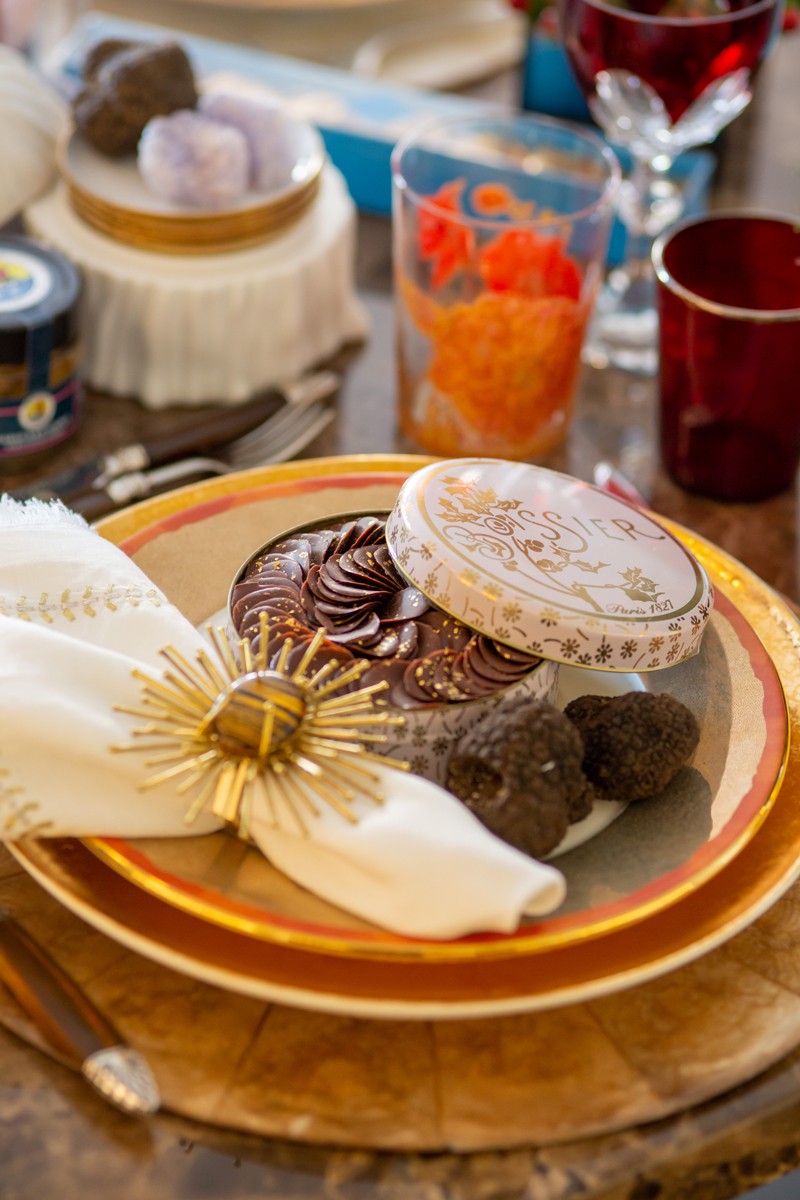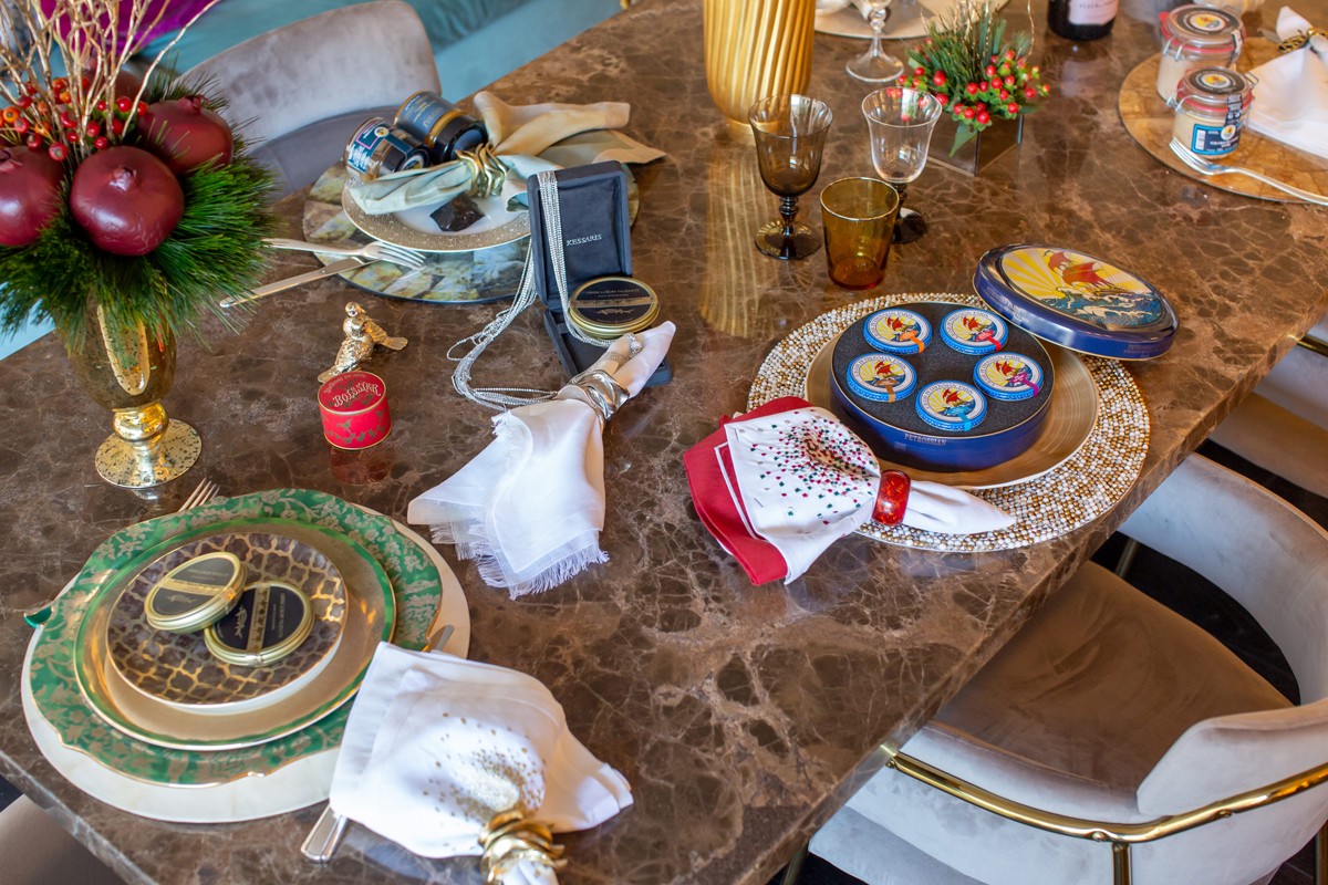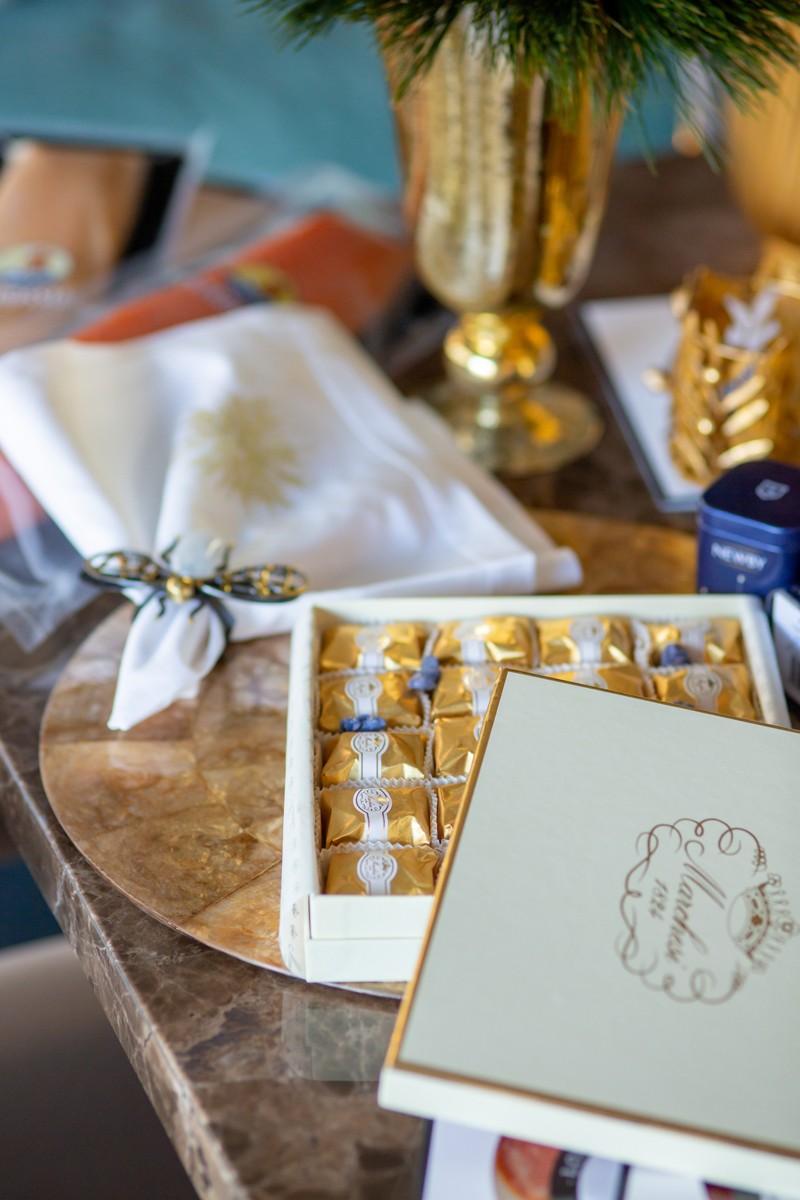 Ή όταν για επιδόρπιο σερβίρονται τα συγκλονιστικά marrons glacés της ιστορικής Pasticceria Marchesi του Μιλάνο, οι Perles Celestes που έγιναν γνωστές από το Harry’s Bar και τα πέταλα σοκολάτας με χρυσό της Maison Boissier. Η λίστα όμως δεν τελειώνει εδώ. Υπάρχουν ακόμα «λευκά» σύκα από την Τοσκάνη, καθαρισμένα ένα- ένα στο χέρι και αποξηραμένα με τρόπο ώστε να μην κιτρινίζουν, μέλι μανούκα και βανίλια Μαινάλου. Τέλος, οι κουραμπιέδες που πλάθονται με αλεύρι από τον πετρόμυλο της Ιταλίας Moulino συνοδεύουν υπέροχα το τσάι της εγγλέζικης Newby που διαθέτει και επάργυρα κουτιά.