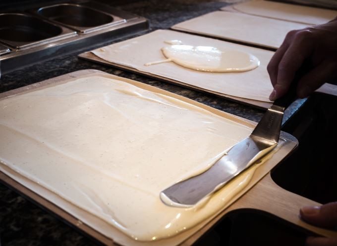 H πλούσια και πικάντικη γεύση της πίτσας οφείλεται στην λεπτή στρώση από κρεμ φρες ή από φρομάζ μπλανκ (fromage blanc), ένα φρέσκο λευκό τυρί σε spread, που προέρχεται από τη βόρεια Γαλλία και το νότιο Βέλγιο. H γεύση τους ενισχύεται συχνά με τριμμένο μοσχοκάρυδο.