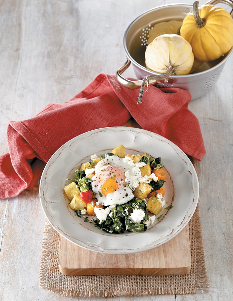 Γλυκοπατάτες και κολοκύθα σαγανάκι με σπανάκι, φέτα και αυγό ποσέ