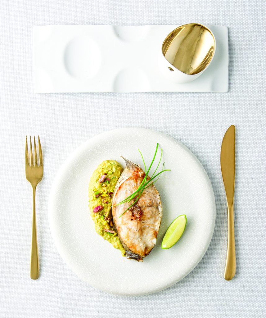 Φιλέτο ψαριού στο φούρνο με πουρέ γλυκοπατάτας, σπανάκι και κοπανιστή Τήνου
