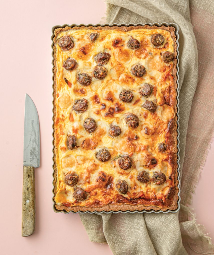 Τάρτα με ζύμη πολύσπορη με γλυκοπατάτα, γραβιέρα και χωριάτικο λουκάνικο