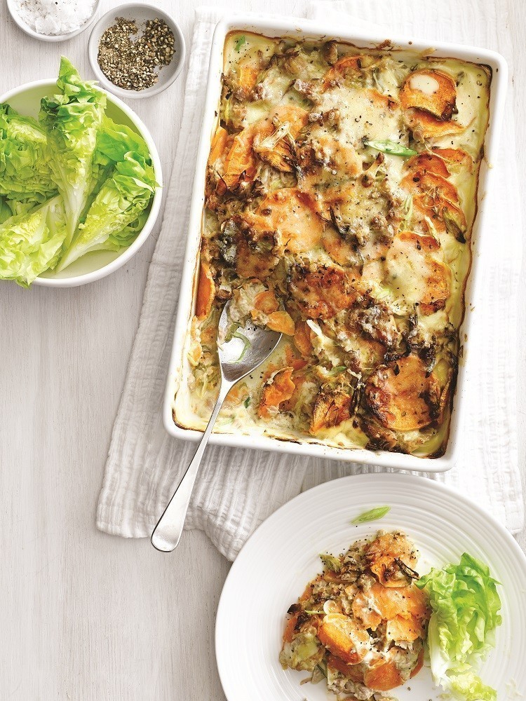 Γκρατέν με τόνο, γραβιέρα και γλυκοπατάτες
