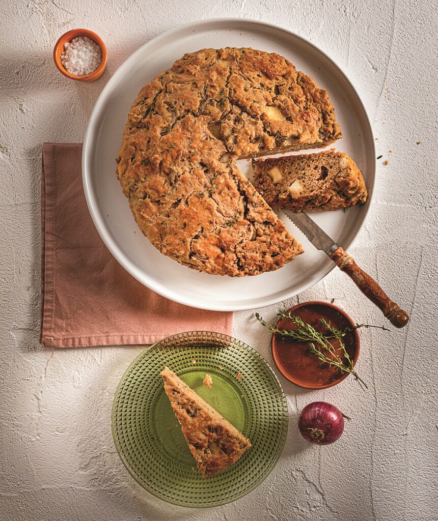 Κρεμμυδόψωμο με χαρουπάλευρο, γραβιέρα και θυμάρι