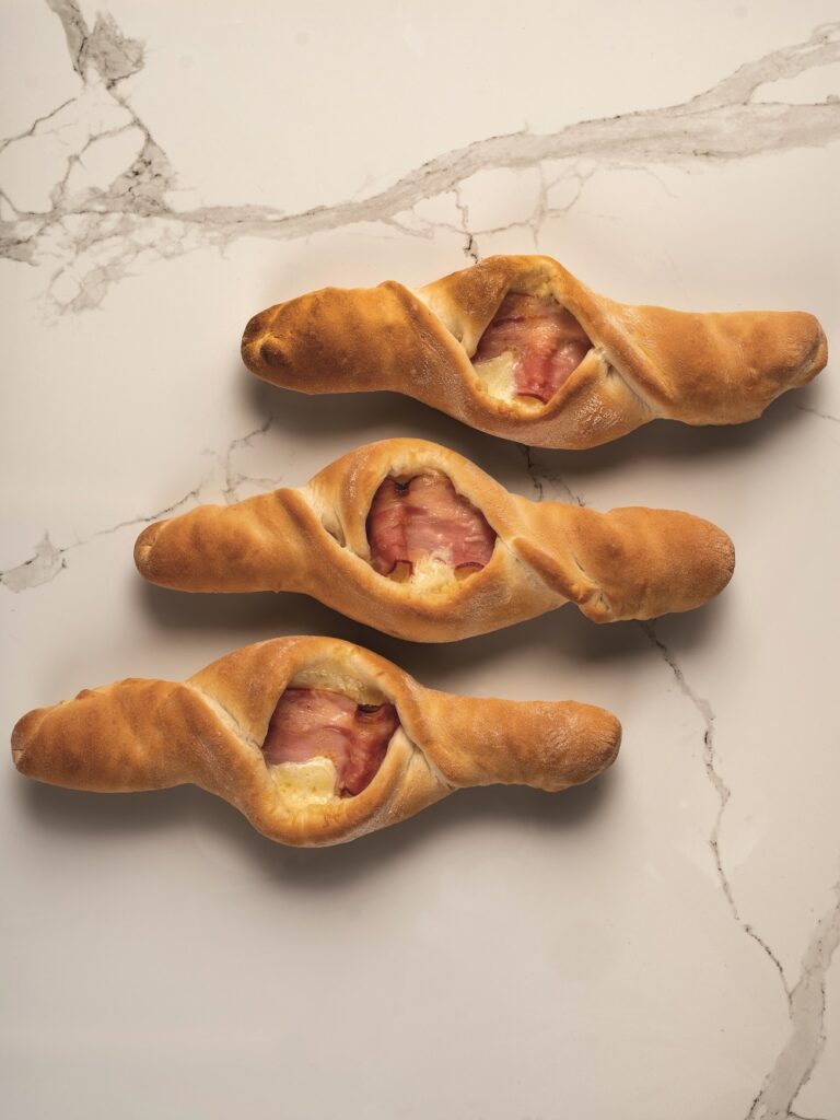 Πλάθουμε μπαλάκια των 120 γρ. και αφήνουμε να ξεκουραστούν για 10΄. Ανοίγουμε με τον πλάστη σε οβάλ σχήμα και αλείφουμε με λίγη σάλτσα ντομάτας. Στη συνέχεια, τοποθετούμε μία φέτα ζαμπόν, προσθέτουμε τριμμένο gouda και, τέλος, μία φέτα μπέικον. Κλείνουμε σε σχήμα πεϊνιρλί.