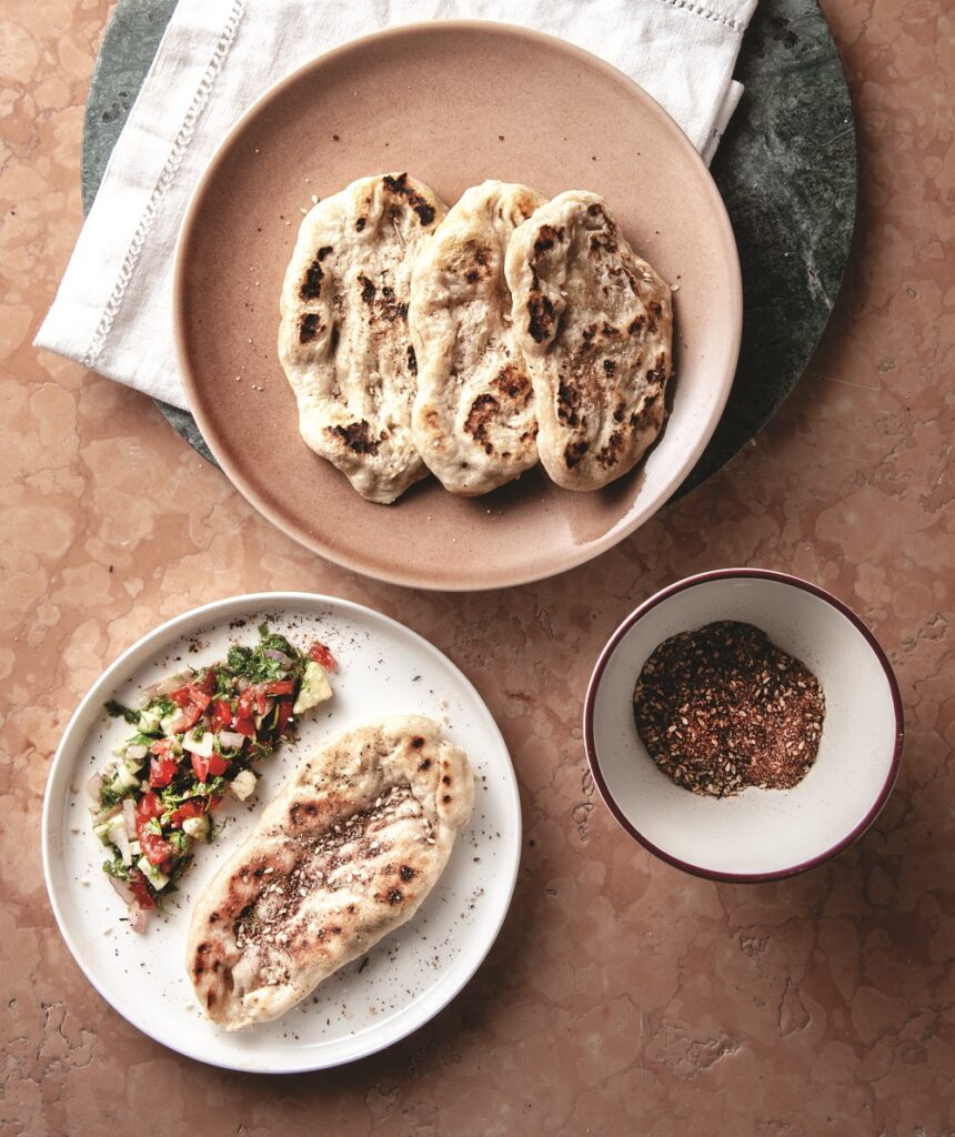 Για το μείγμα μπαχαρικών ζαατάρ: Σε έναμπολ ανακατεύουμε όλα τα μπαχαρικά μαζί εκτός από σουσάμι. Σε ένα γουδί πατάμε το σουσάμι και ομογενοποιούμε μαζί με τα υπόλοιπα υλικά. Αφήνουμε στην άκρη.