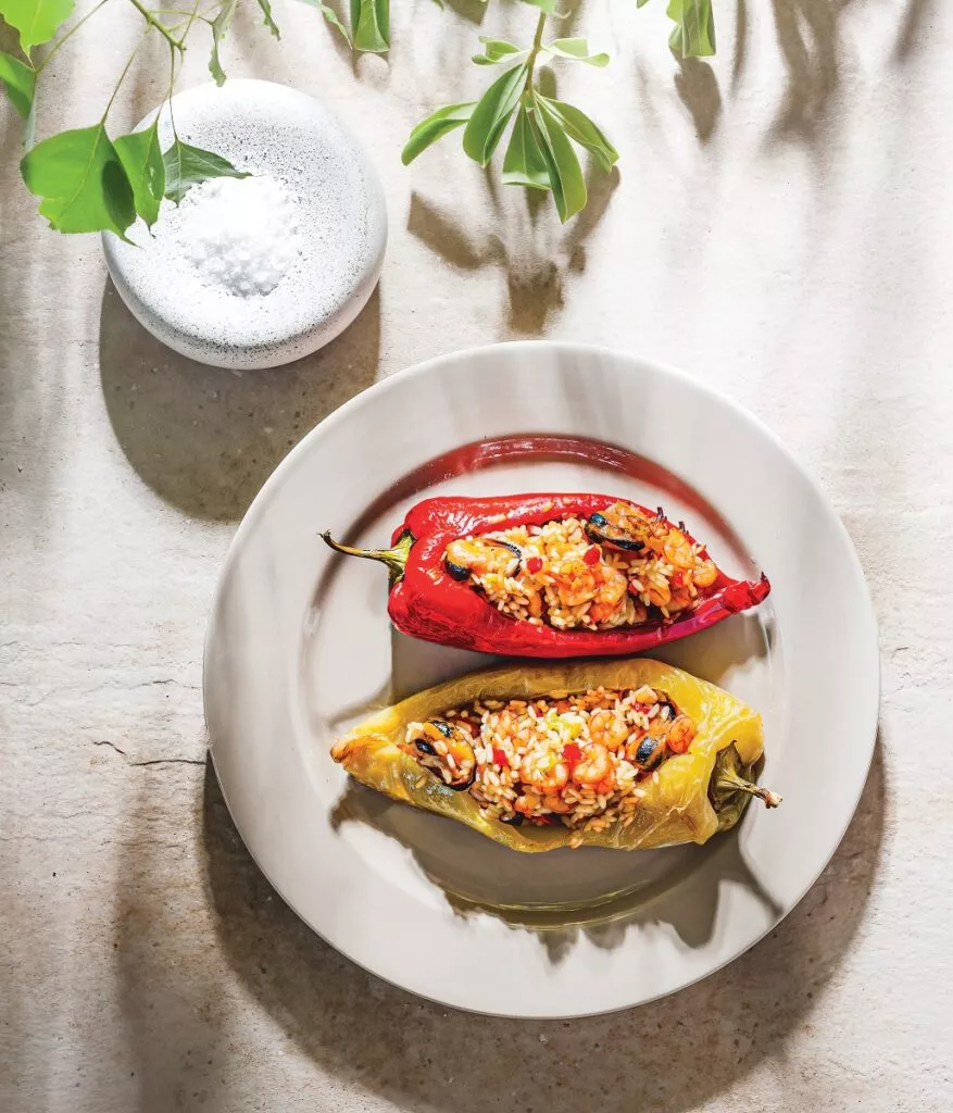 Πολύχρωμες πιπεριές γεμιστές με χταποδόρυζο