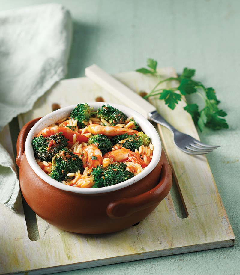 Εναλλακτικό, θαλασσινό γιουβέτσι, το οποίο γίνεται ακόμη πιο νόστιμο χάρη στο μπρόκολο, που δένει άψογα με τις γαρίδες.