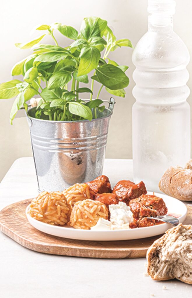 Γιουβέτσι με κριθαροκεφτέδες και κεφαλογραβιέρα