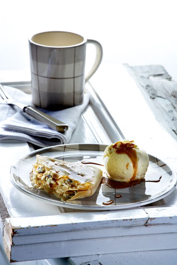 Κρέπες με τυρί κρέμα, ρακόμελο και σάλτσα καραμέλα