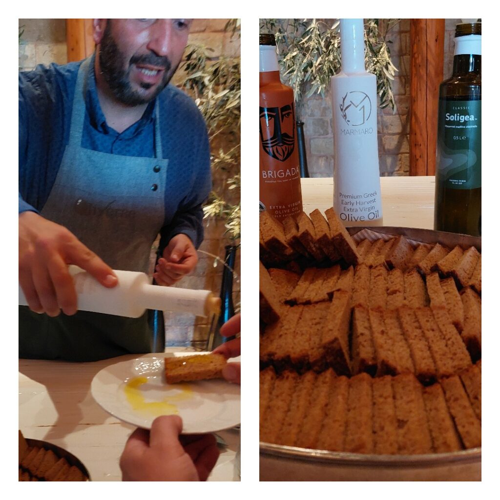Η βραδιά παρουσίασης έκλεισε με γευσιγνωσία εξαιρετικού παρθένου ελαιολάδου σε συνδυασμό με διαφορετικά ψωμιά της Puratos. Εδώ, ο εξειδικευμένος ελαιολόγος Παναγιώτης Παπανικολόπουλος ετοίμασε ένα ενδιαφέρον γευστικό pairing. Ξεκινώντας από ένα πιο ήπιο εξαιρετικό παρθένο ελαιόλαδο, το πάντρεψε με ένα πιο ελαφρύ ψωμί, όπως είναι η τσιαπάτα. Στη συνέχεια, επέλεξε ένα ολικής με προζύμι, για ένα μεσαίας έντασης ε.π. ελαιόλαδο. Το πιο βαρύ από όλα, κορωνέικης ποικιλίας επέλεξε να το ταιριάξει με ένα πιο έντονο ψωμί, σικάλεως. Ωστόσο, μιλώντας μαζί του είχα την ευκαιρία να υποβληθώ σε ένα μικρό πείραμα, ώστε να γευτώ καλύτερα την κορύφωση στην ένταση του ελαιολάδου. Δοκίμασα το ίδιο ψωμί, το ολικής με προζύμι με τα 3 ελαιόλαδα, ξεκινώντας από το πιο ήπιο και ολοκληρώνοντας τη διαδικασία με το πιο βαρύ. Ήταν ένα πολύ ενδιαφέρον πείραμα, με πρωταγωνιστή το ελαιόλαδο βέβαια και όχι το ψωμί, το οποίο ευελπιστώ να επαναλάβω και σε επόμενες γευσιγνωσίες, με άλλα τρόφιμα.