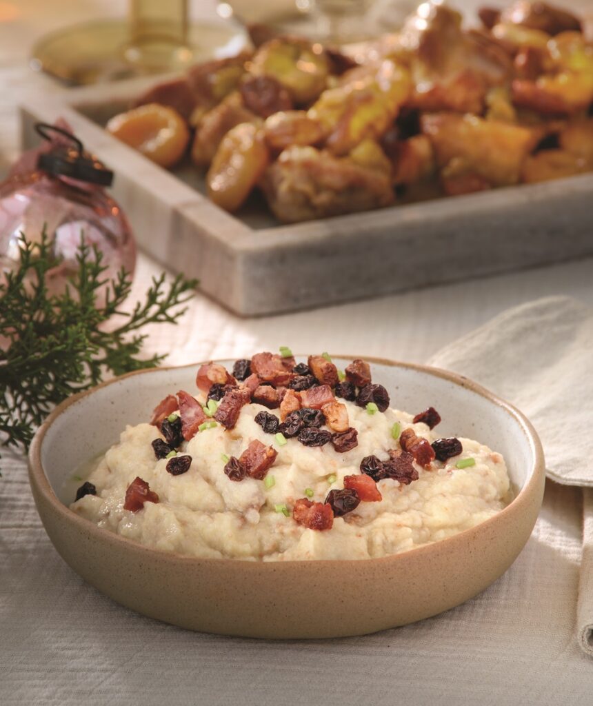 Πουρές από κουνουπίδι και αμύγδαλα, με σταφίδες και καραμελωμένο μπέικον