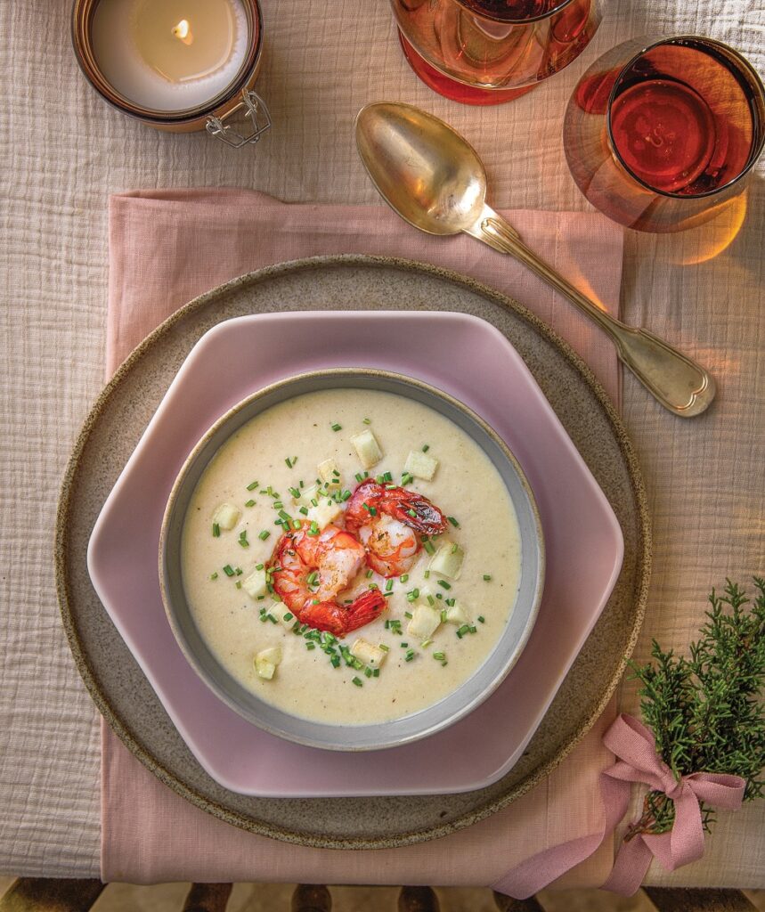 Βελουτέ σελινόριζας αρωματισμένη με χαμομήλι, με γαρίδες και ξινόμηλο