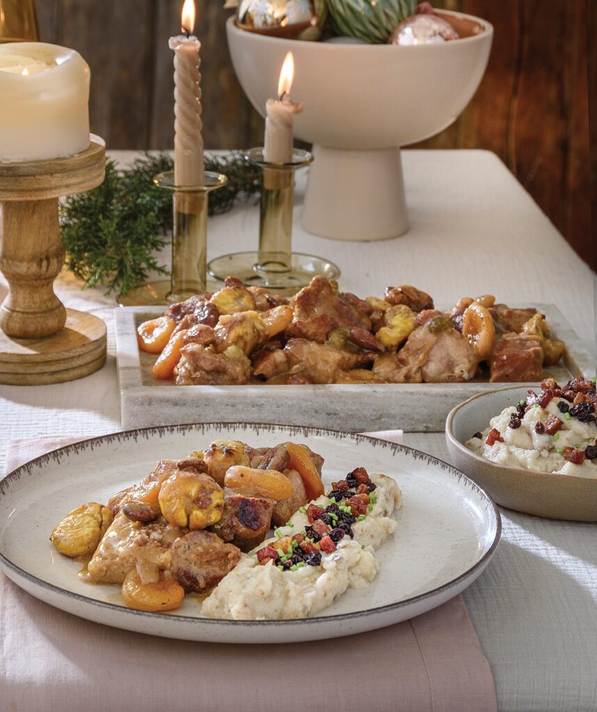 Χοιρινή σπάλα με αποξηραμένα βερίκοκα, κάστανα, αμύγδαλα και γλυκό κρασί