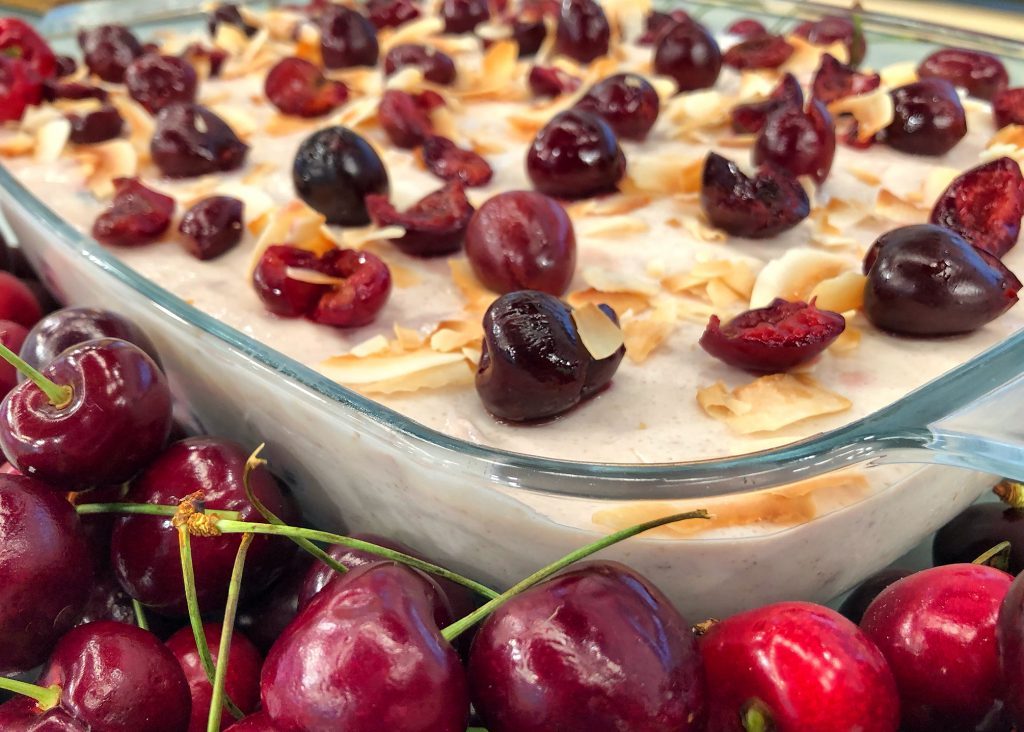Καλοκαιρινό γιαουρτογλυκό με ψητά κεράσια και καρύδα