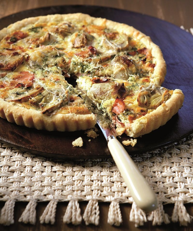 Μία ξεχωριστή ανοιξιάτικη τάρτα με αγκινάρες. Την εμπλουτίζετε με μπέικον και γίνεται ακόμη πιο λαχταριστή.