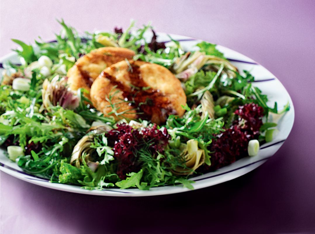 Πράσινη σαλάτα με αγκινάρες και παναρισμένο ανθότυρο