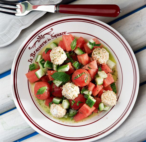 Σαλάτα με καρπούζι, ντομάτα, σουσαμένιες τυρομπαλίτσες και λάδι δυόσμου
