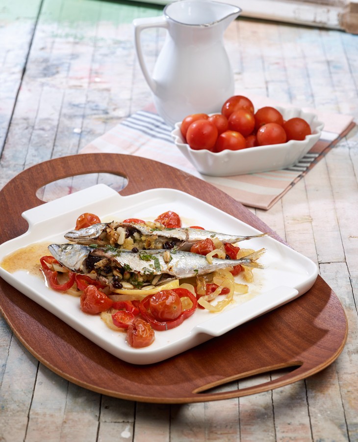 Οι κολιοί είναι αρκετά λιπαρά ψάρια, γι’ αυτό αποφύγαμε να τους βαρύνουμε κι άλλο με σάλτσα ντομάτας και κρεμμύδια. Τους ψήσαμε λοιπόν πάνω σε ένα στρώμα από χρωματιστές πιπεριές, φέτες λεμονιού και ντοματίνια, γεμίζοντας την κοιλίτσα τους με ένα αρωματικό μίγμα.