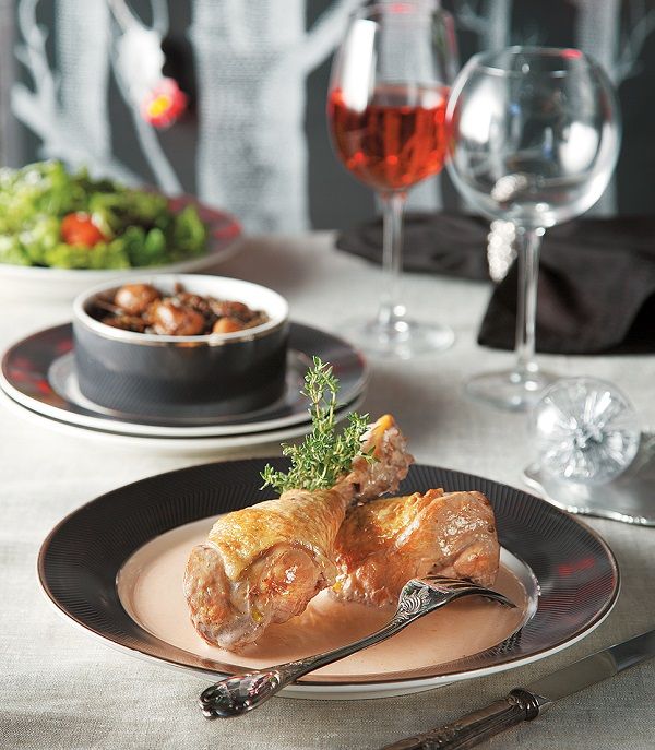 Σερβίρετε τον κόκορα με ζεχωριστή, ροζ σάλτσα από αφρώδες κρασί και έχετε αμέσως ένα πιάτο ιδανικό και για κάθε γιορτινό τραπέζι. Η γαρνιτούρα με μαύρο ρύζι και κάστανα είναι απλά υπέροχη. Δείτε τη συνταγή ΕΔΩ