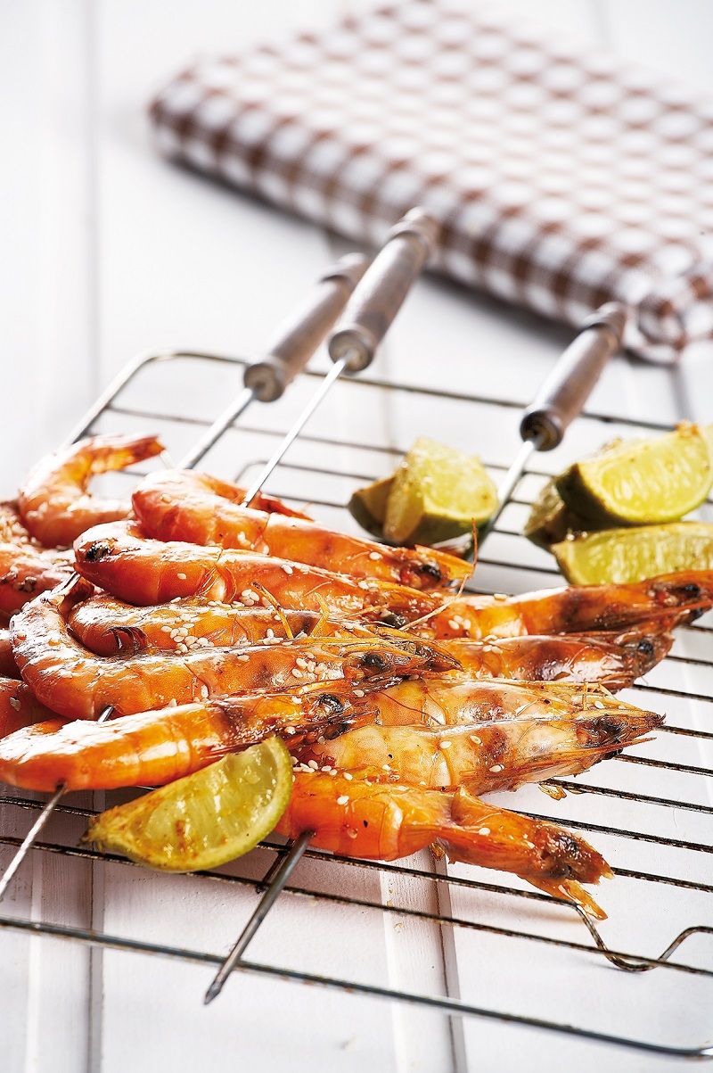 Θαλασσινά σουβλάκια με γαρίδες, για όσους αναζητούν ένα εναλλακτικό μεζέ για τη μπίρα τους. Γαρνίρετε με ψημένες φέτες λάιμ. Δείτε τη συνταγή ΕΔΩ