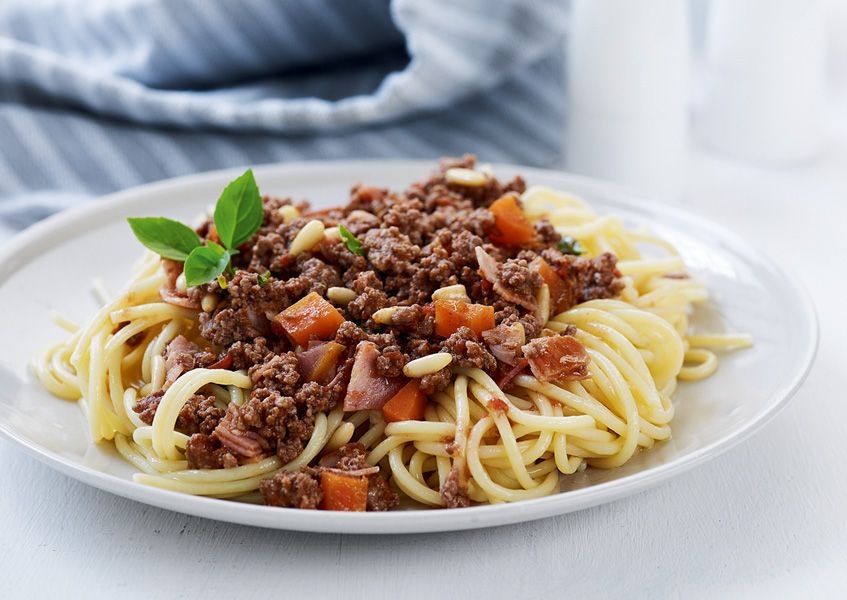 Το μπέικον, το κουκουνάρι και ο βασιλικός απογειώνουν γευστικά την κλασική σάλτσα κιμά, που σερβιρισμένη πάνω σε μια μακαρονάδα είναι το πιο αγαπημένο πιάτο μικρών και μεγάλων.