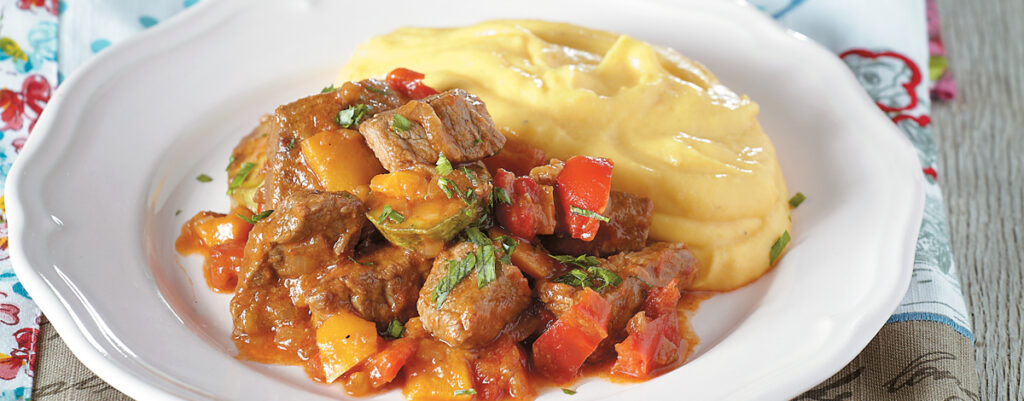 Από τα πιο κλασικά φαγητά για το οικογενειακό τραπέζι, στην εκδοχή της Γεωργίας Κοφινά το κοκκινιστό μοσχάρι σερβίρεται ιδανικά με ρύζι με πολύχρωμα λαχανικά.