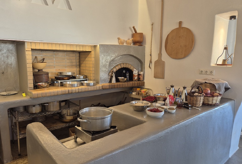 Το γευστικό καλωσόρισμα ολοκληρώνεται σύντομα, καθώς τα κεράσματα εξαφανίζονται εν ριπή οφθαλμού και οι συμμετέχοντες στη γαστρονομική εμπειρία οδηγούνται στην ιδιαίτερα φροντισμένη κοινόχρηστη κουζίνα, έναν κατάλευκο θολωτό χώρο με χτιστές εσοχές όπου βρίσκουν τη θέση τους παλιά μαγειρικά σκεύη και σε περίοπτη θέση κορνιζαρισμένες οι σελίδες του βιβλίου «Αναφορά στον Γκρέκο» στις οποίες ο συγγραφές πλέκει το εγκώμιο της Νάξου. Ο λαμπερός χώρος αν και νεόχτιστος, μιμείται τις παραδοσιακές κουζίνες όπου μαζεύονταν κάθε τόσο οι νοικοκυρές κάθε χωριού για να ψήσουν το ψωμί της εβδομάδας.