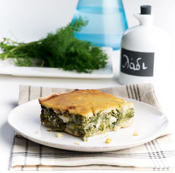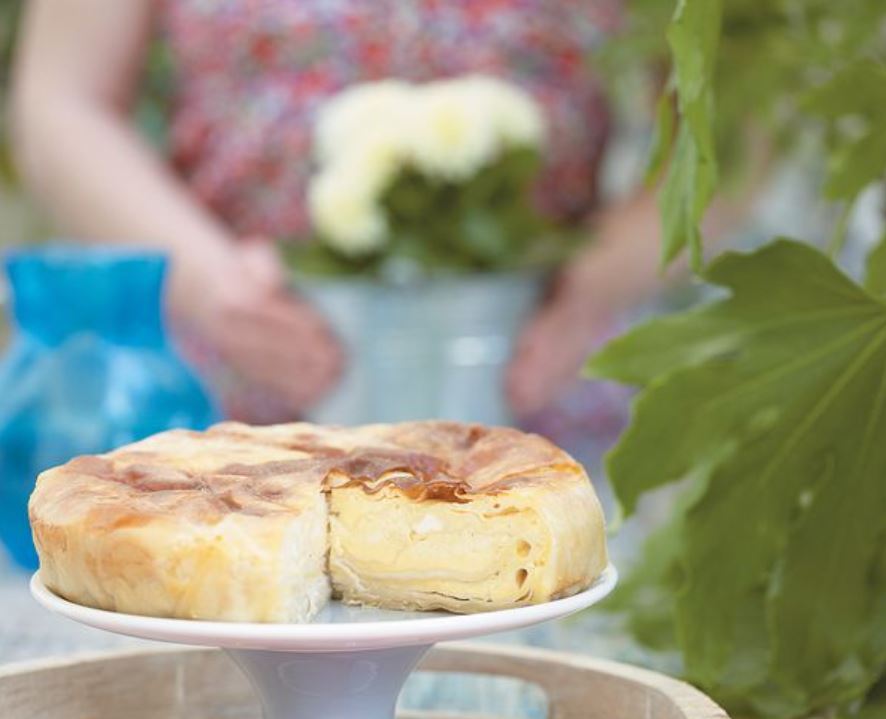 Μια πλούσια πίτα με πολλές στρώσεις από φύλλα εναλλάξ με γέμιση φέτας, φρέσκo τυρί και πολλά αβγά. Η παραδοσιακή συνταγή θέλει στρογγυλό ταψί.