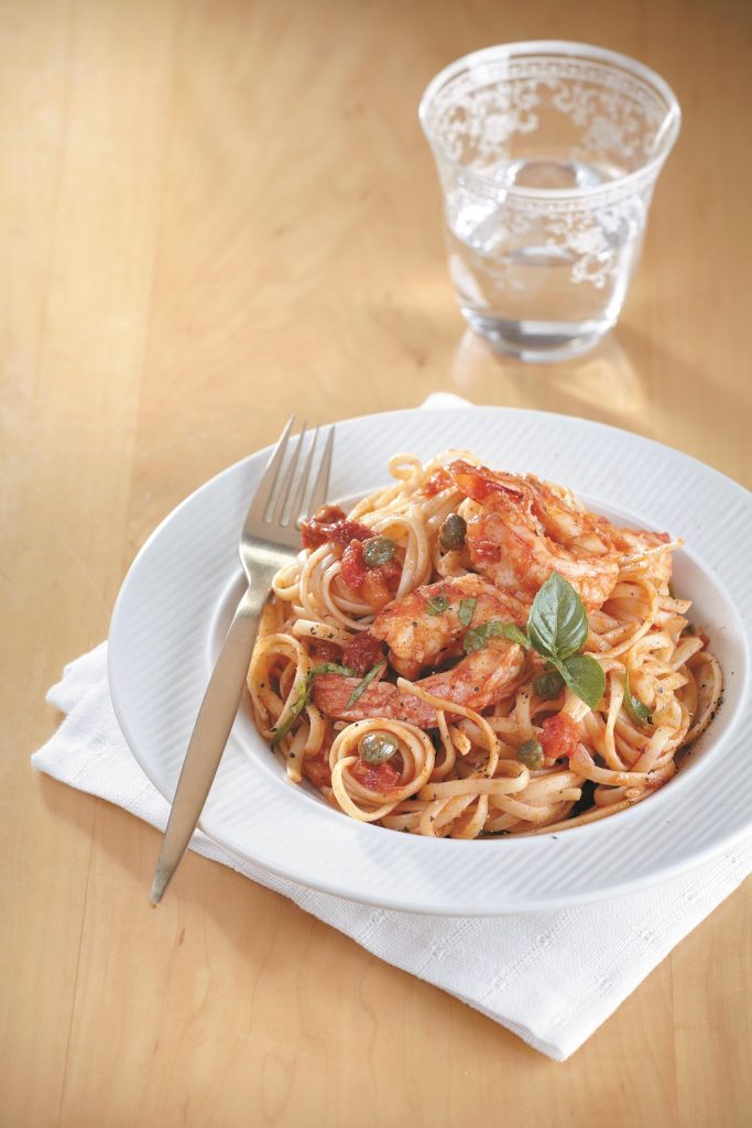 Λιγκουίνι με γαρίδες, ντομάτα, κάππαρη και βασιλικό