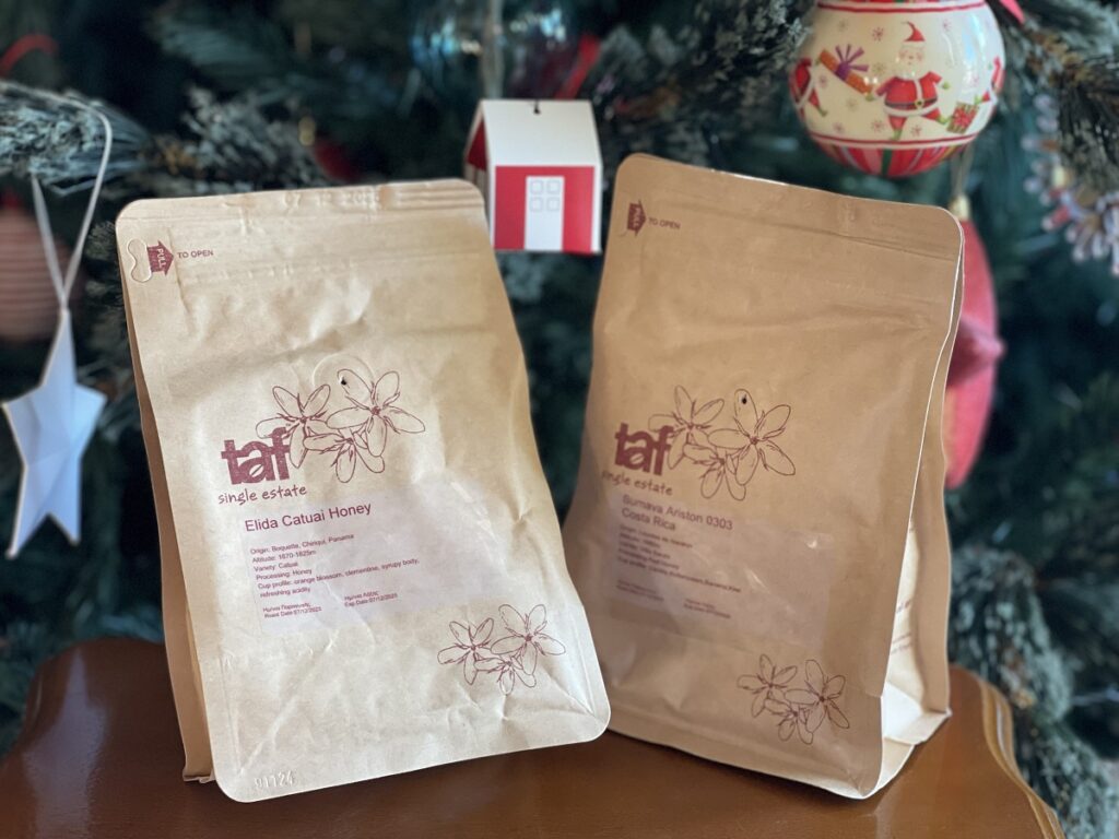 Ο καφές φίλτρου που επέλεξε για μας η εταιρία taf είναι από τον Παναμά και έχει όμορφη, “δροσερή” οξύτητα. Το άρωμα όσο και η γεύση που κυριαρχεί στο φλιτζάνι είναι εκείνο του πορτοκαλιού και στο τέλος αφήνει μια απολαυστική γλυκιά επίγευση. Κλείνει όμορφα ένα γεύμα, αλλά μπορείτε να τον απολαύσετε και με τη συνοδεία ενός σοκολατένιου γιορτινού κορμού. Από την άλλη ο καφές για espresso είναι από την Κόστα Ρίκα, πιο “βουτυράτος” με έντονη την βανίλια και νότες από μπανάνα και kiwi. Πίνεται ευχάριστα και τις πρωινές ώρες αλλά και στο τέλος κάποιου γεύματος. Δεν θα σας τον προτείναμε να του προσθέσετε γάλα ούτε και ζάχαρη μιας και έχει γλυκά χαρακτηριστικά.