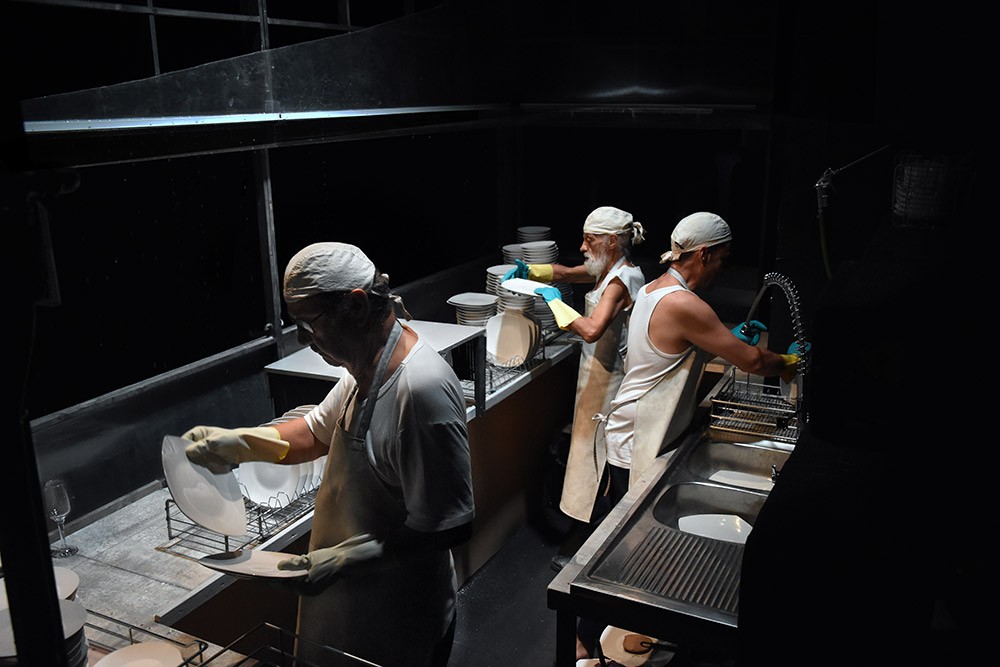 Στο υπόγειο ενός πολυτελούς εστιατορίου, οι λαντζέρηδες εργάζονται συντονισμένα ανάμεσα σε ατελείωτες στοίβες πιάτων, αθέατοι από τον πάνω κόσμο, που τους στέλνει αδιάκοπα τ’ άπλυτά του. Ο Ντρέσλερ ο αυστηρός προϊστάμενος, για τον οποίο το πλύσιμο των πιάτων είναι τέχνη, καθήκον, αξιοπρέπεια, o νεοφερμένος Έμετ, που μαθαίνει τη δουλειά και δε βλέπει την ώρα να ξεφύγει, ο Μος, ο ταλαίπωρος γέρος που εργάζεται εκεί κάτω εδώ και δεκαετίες και τέλος ο Μπάροουζ, που θα έρθει όταν το προσωπικό ανανεωθεί. Σε διαφορετική φάση της ζωής τους ο καθένας και με ετερόκλητες αντιλήψεις και επιθυμίες βρίσκονται εκεί κάτω παγιδευμένοι σαν ήρωες του Μπέκετ σε μια ατέρμονη επαναληπτικότητα, σχεδόν σ’ ένα κενό χρόνου, και αντιδικούν για το νόημα της δουλειάς τους, για το νόημα της ίδιας της ζωής. Υπάρχει, ωστόσο, νόημα;
