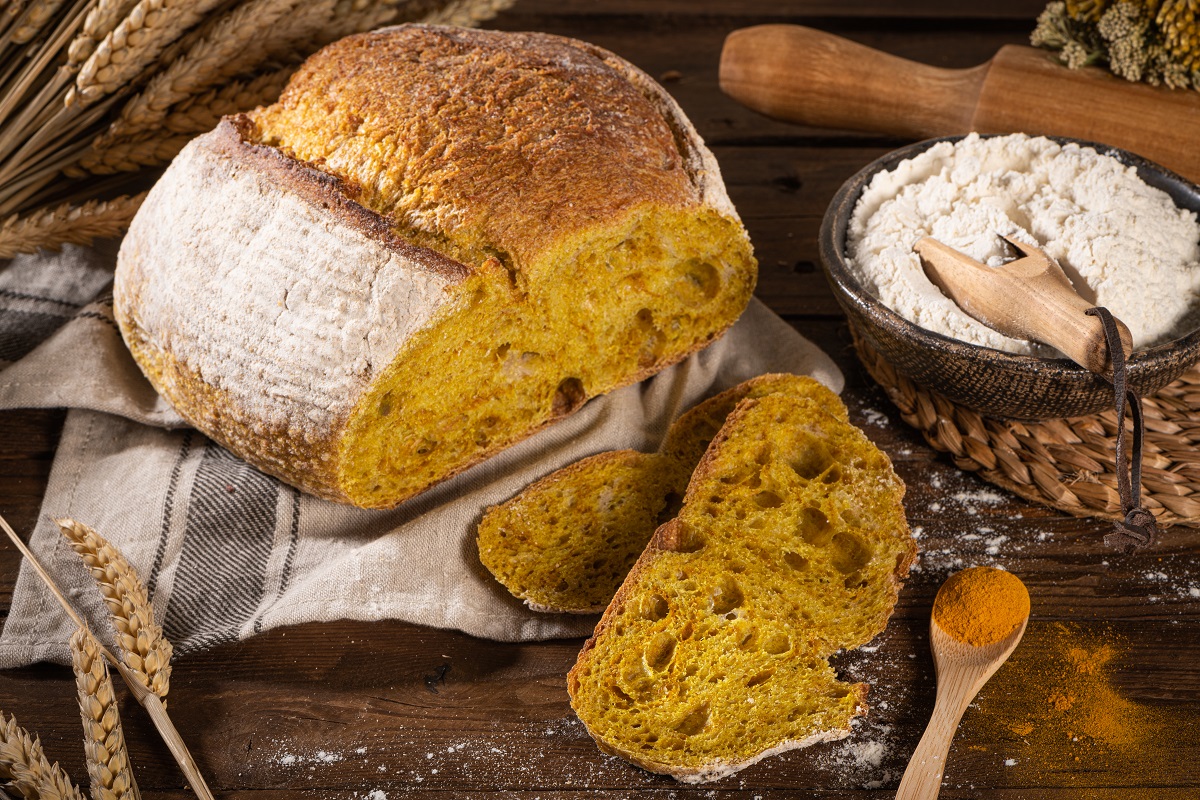 Εμπλουτίζουμε τα ψωμιά και τις ζύμες με κουρκουμά. Δίνει υπέροχη γεύση σε όλες τις συνταγές, ενώ στα λευκά άλευρα χαρίζει και ένα όμορφο χρυσαφένιο χρώμα. Ετοιμάζουμε μπιρόψωμο με κουρκουμά και καρύδια ή χαρουπάλευρο και απολαμβάνουμε σκέτο ή με το φαγητό μας.