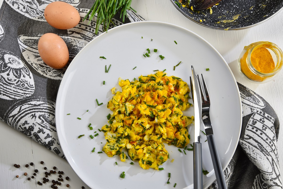 Χρησιμοποιούμε μια πρέζα κουρκουμά στην ομελέτα, τη φριτάτα ή το τοφου μας. Και πραγματικά, τα scrambled eggs με κουρκουμά είναι το πιο υγιεινό και αντιφλεγμονώδες πρωινό! Αν είναι η πρώτη φορά που δοκιμάζουμε το ιδιαίτερο καρύκευμα αυτός ο τρόπος είναι ιδανικός για να ξεκινήσουμε γιατί η γεύση είναι πιο διακριτική.