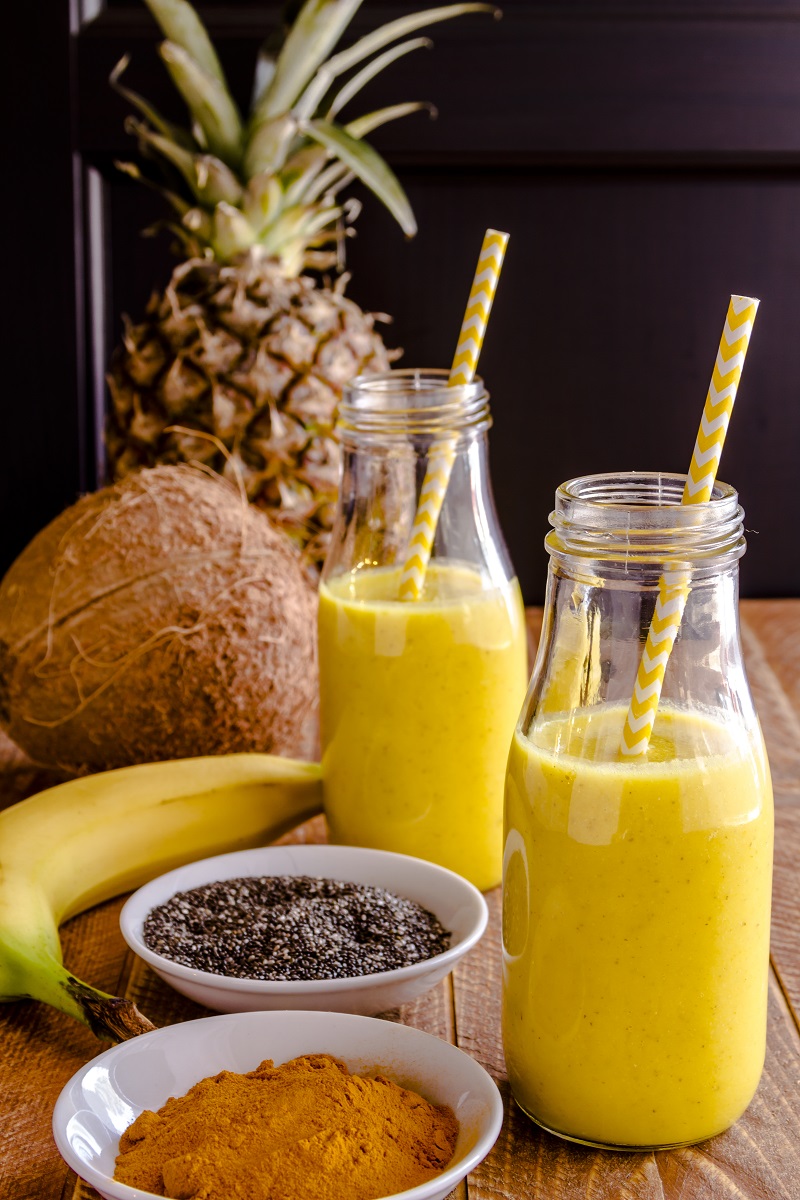 Μπορούμε να βάλουμε στα smoothies και τους χυμούς μας φρέσκια ρίζα κουρκουμά, όμως και σε μορφή σκόνης δίνει ένα εξίσου ωραίο αποτέλεσμα. Φτιάχνουμε αποτοξινωτικό smoothie με ανανά, κουρκουμά και καρύδα και απολαμβάνουμε την έκρηξη γεύσεων στο στόμα μας.