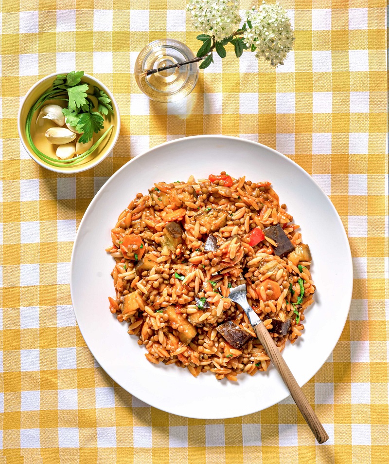 Όταν τα λαχανικά αρχίσουν να μαλακώνουν λίγο, προσθέτουμε στο φαγητό το κριθαράκι και λίγο νερό. Το κριθαράκι θα χρειαστεί περίπου 10′ για να ψηθεί και να απορροφήσει το μεγαλύτερο μέρος της σάλτσας και του νερού της κατσαρόλας.