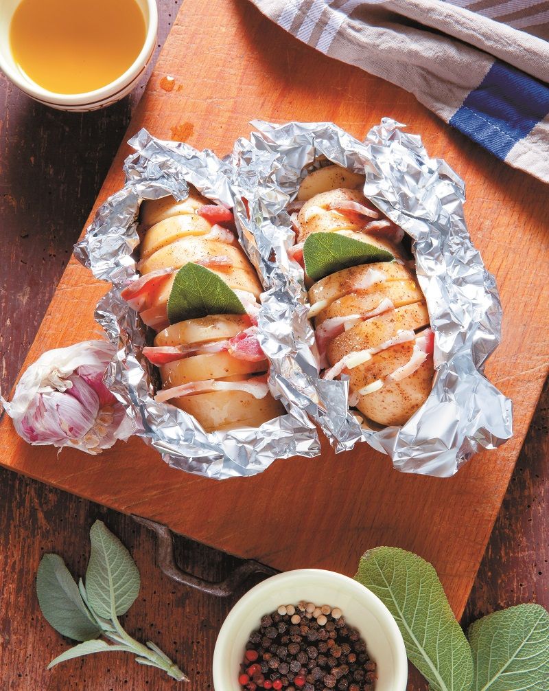 Πατάτες ακορντεόν στο αλουμινόχαρτο με σκορδόλαδο, κασέρι και μπέικον