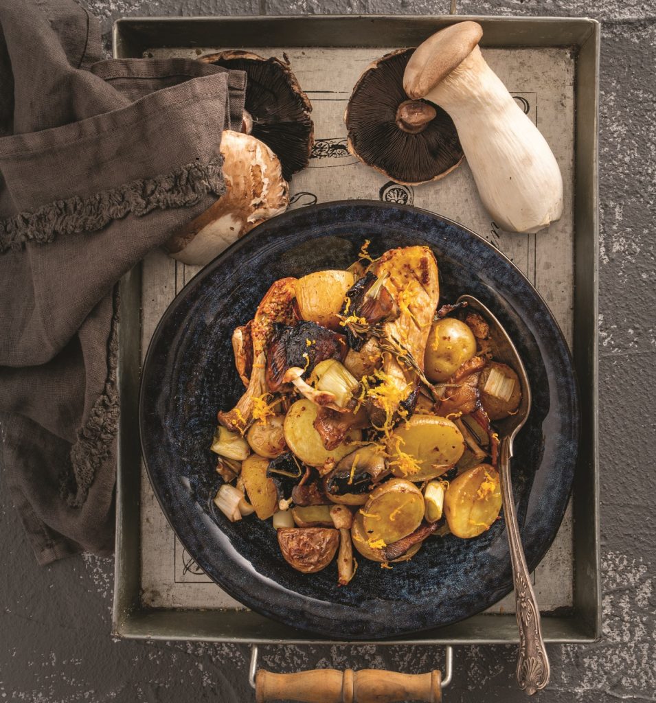 Baby πατάτες με μανιτάρια στον φούρνο, αρωματισμένα με πορτοκάλι και δεντρολίβανο