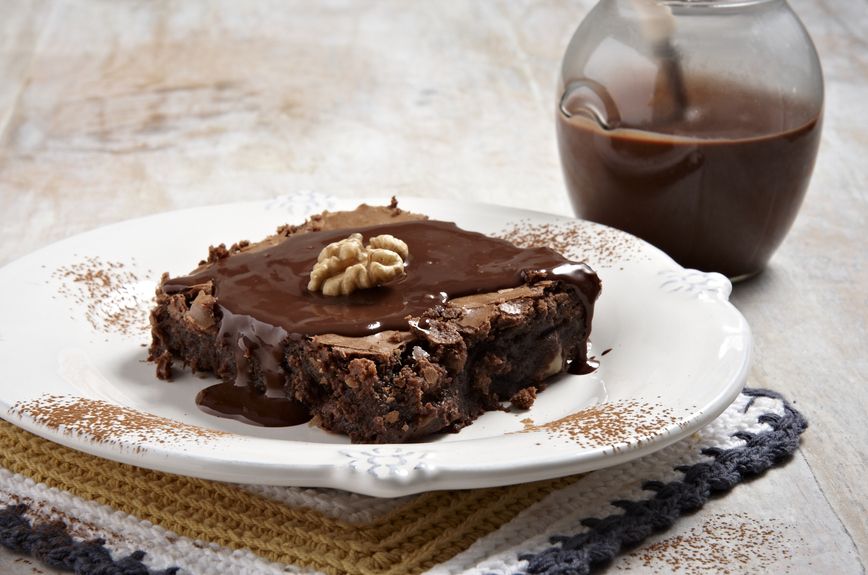 Ζουμερή και απίστευτα λαχταριστή σοκολατόπιτα με καρύδια, που σερβίρετε με σάλτσα σοκολάτας και αν θέλετε με μία μπάλα παγωτό.