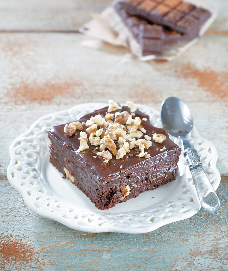Σοκολατόπιτα με καρύδια και επικάλυψη σάλτσας σοκολάτας